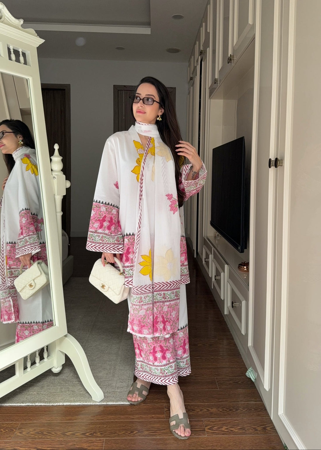 Elegant White Mul Cotton Suit Set with Pink Floral Print & Dupatta U62