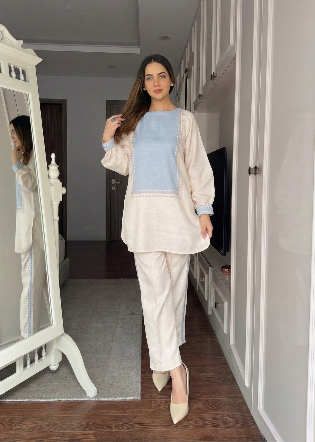 Experience graceful movement in this full-length SET. The crisp white fabric is accented by rich...