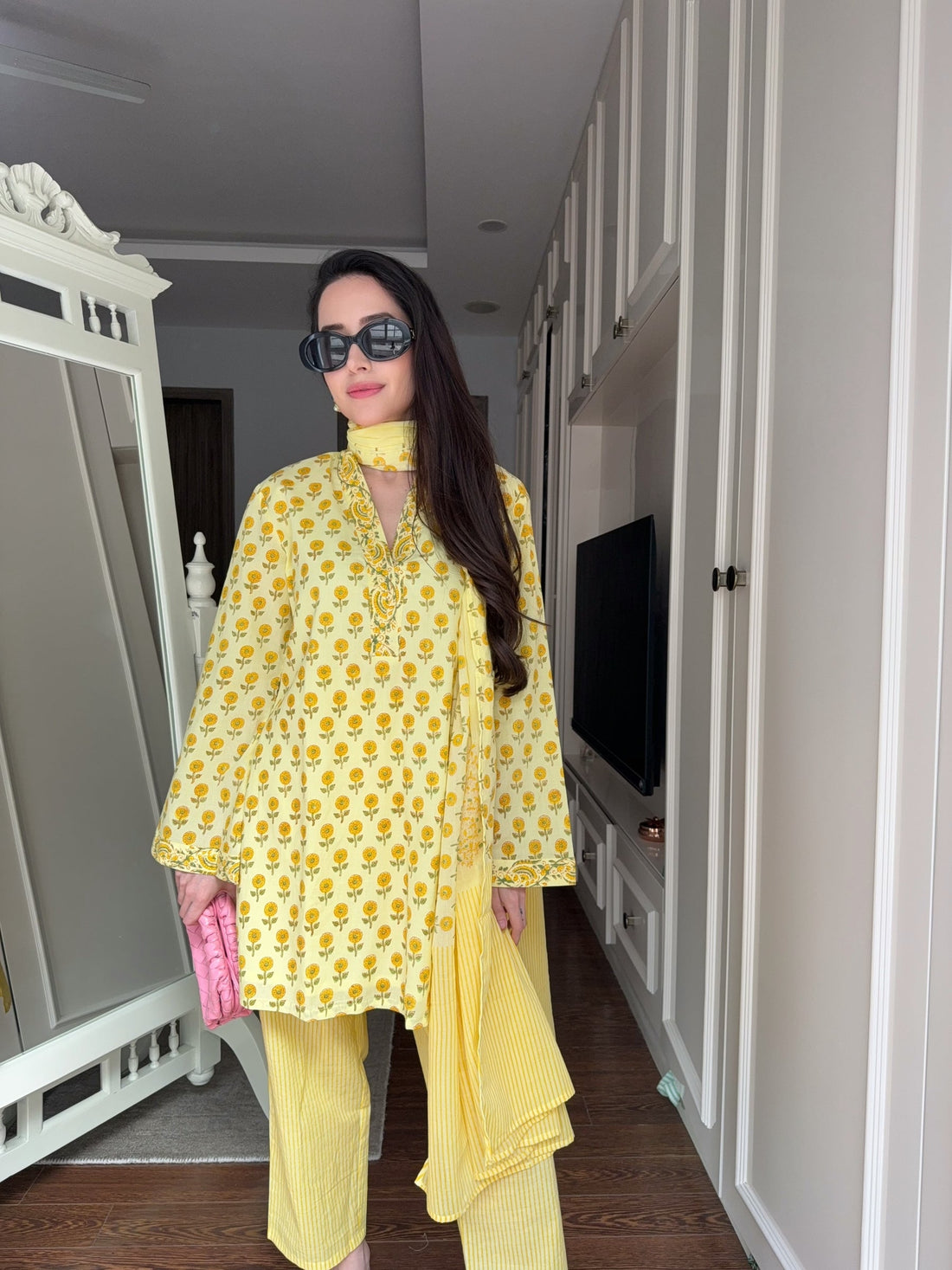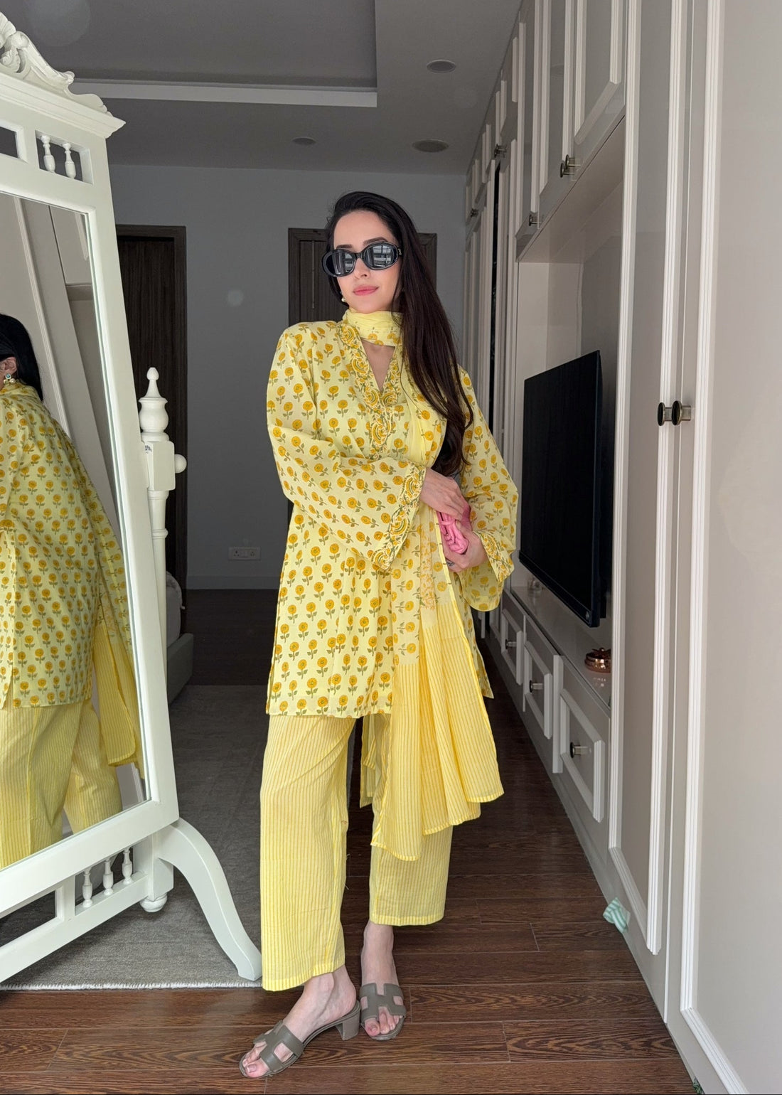 Yellow Floral Pure Mul Cotton Suit Set with Striped Pants & Dupatta U61