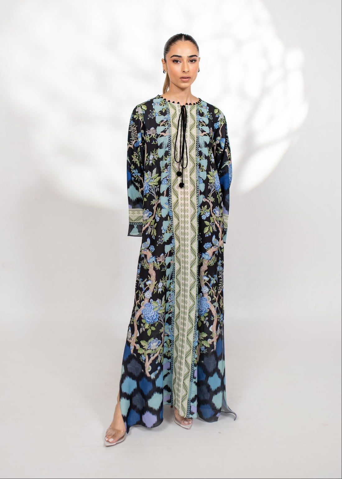 Teal Floral & Diamond Print Long Kaftan | Effortless Resort Style for Women U44
