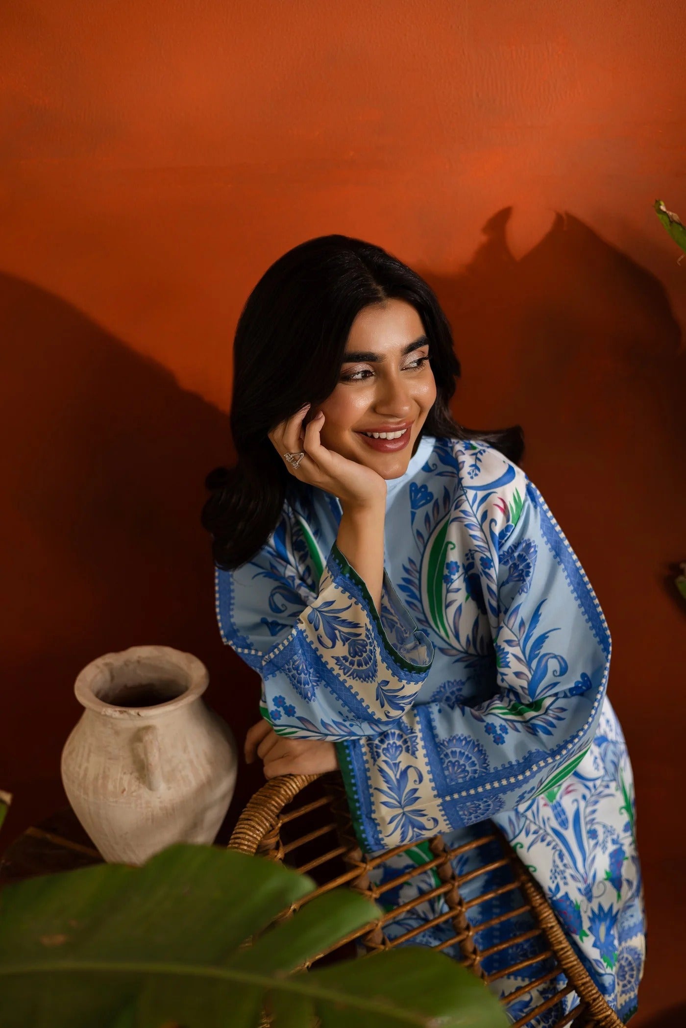 Elegant blue co-ord set featuring intricate floral and paisley digital prints in vibrant shades of blue and green. Perfect blend of comfort and style for casual and festive wear.
