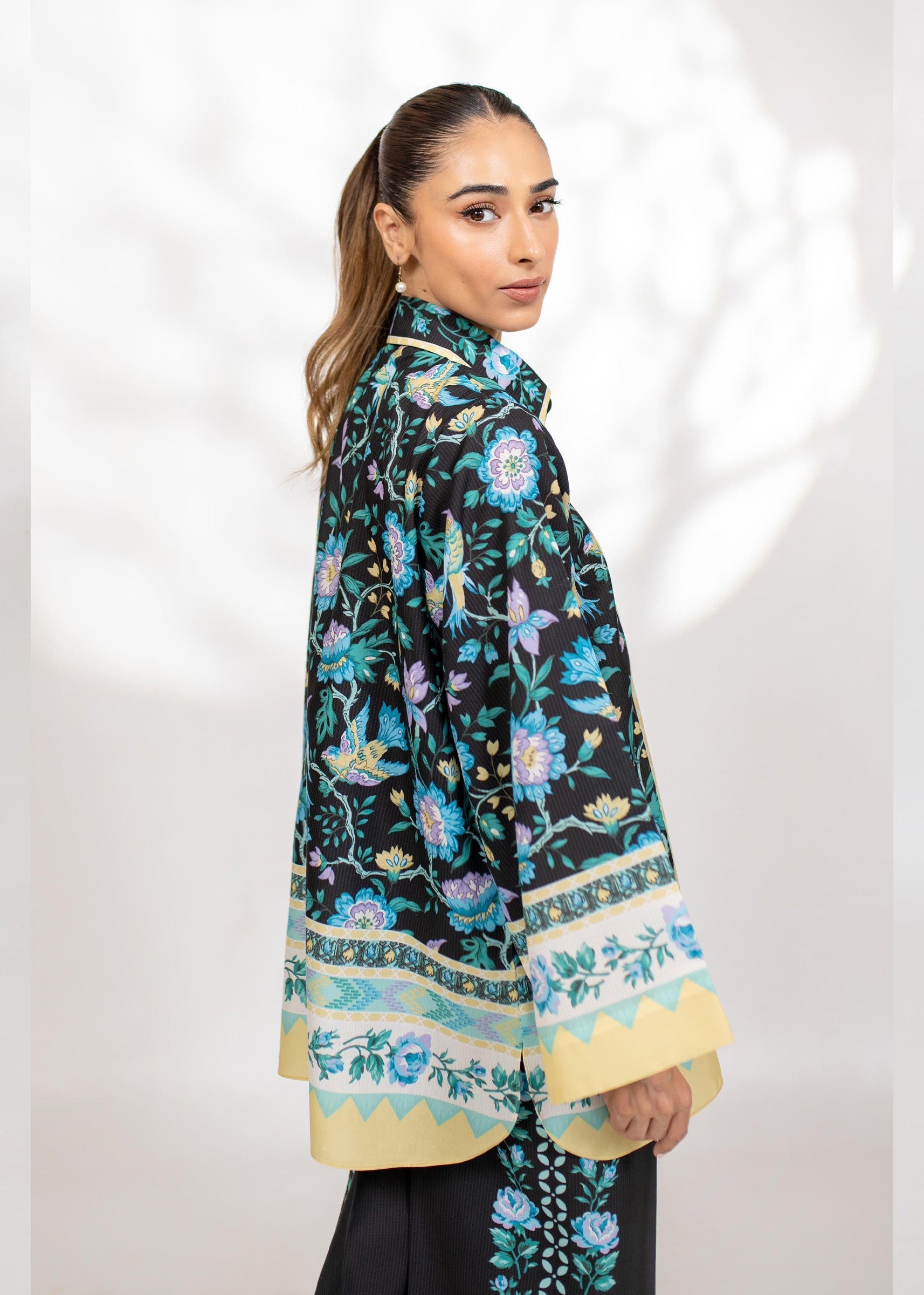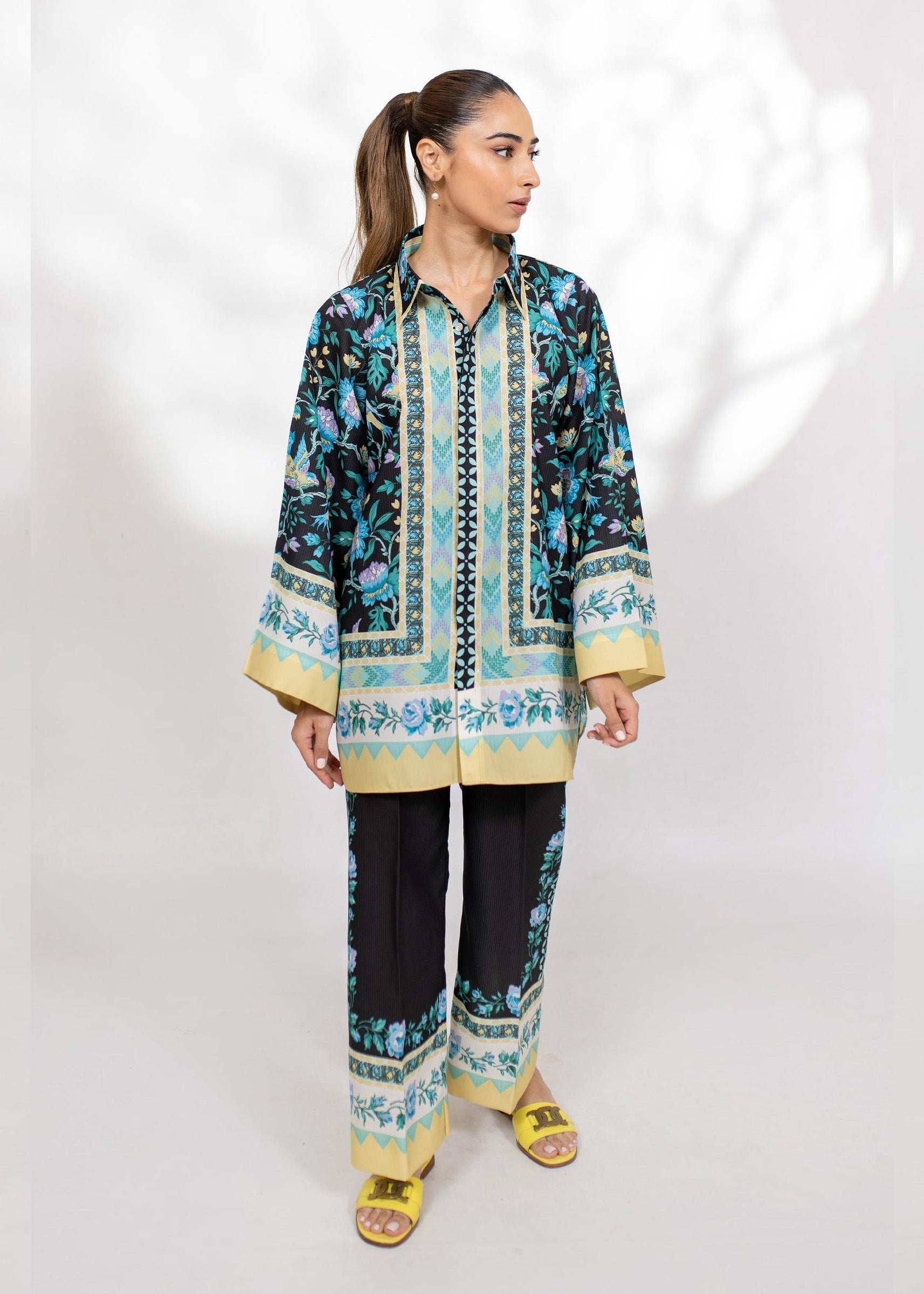 A striking co-ord set with vibrant floral digital prints on black, highlighted with yellow borders and matching trousers. Elegant, bold, and effortlessly chic,