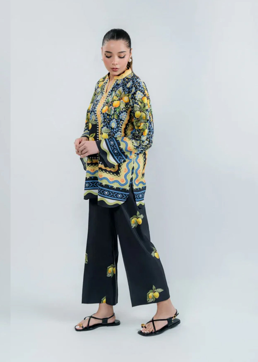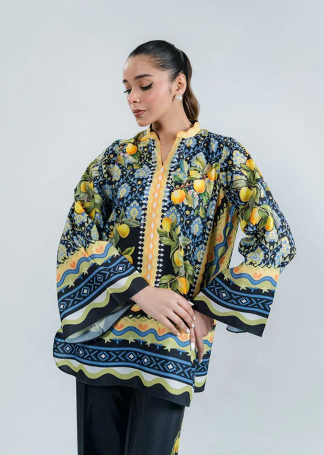 A vibrant co-ord set with citrus lemon prints and ethnic borders in navy and mustard. Stylish wide sleeves paired with matching trousers for a bold summer statement.