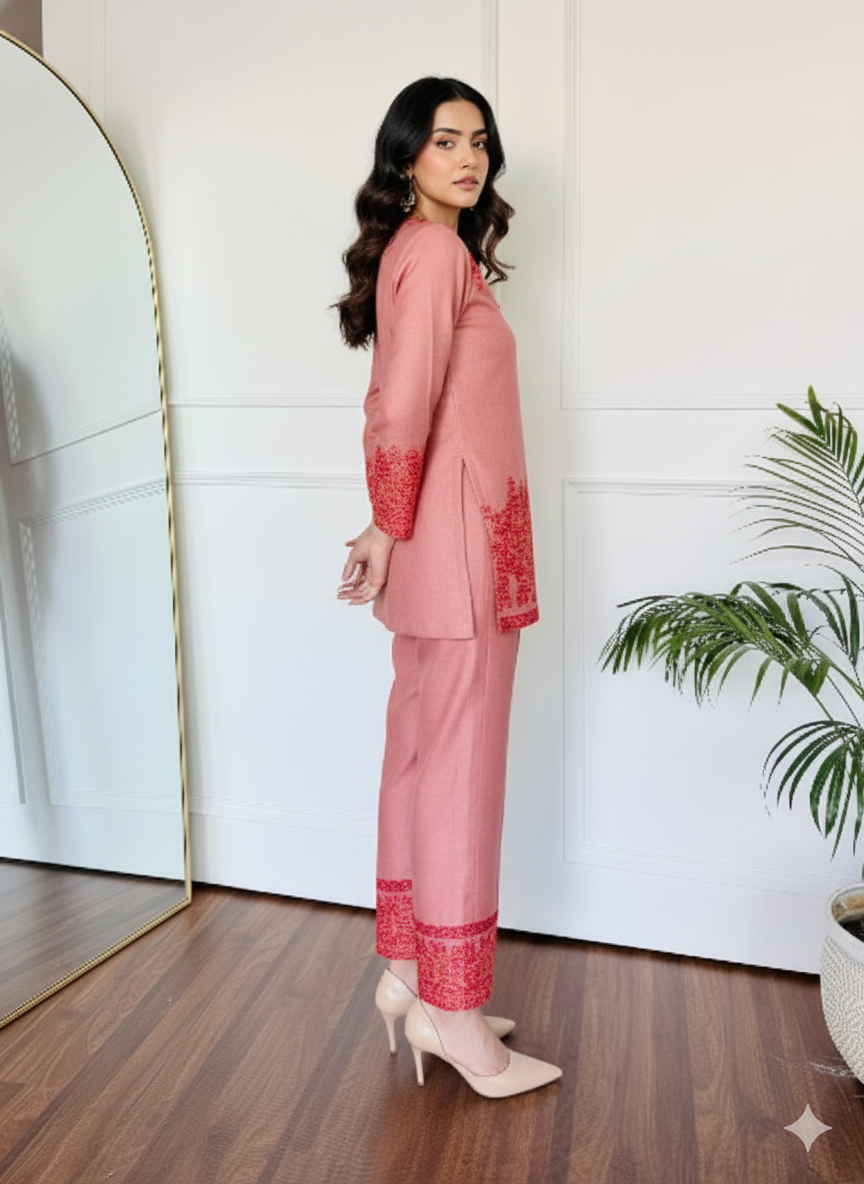 Elevate your everyday style with this stunning pink embroidered kurta and pant set, designed for women who love effortless elegance. The kurta features intricate red embroidery along the sleeves and hemline, giving it a rich and graceful appeal. Its soft fabric ensures comfort throughout the day, while the straight-cut silhouette adds a modern touch to the traditional design.