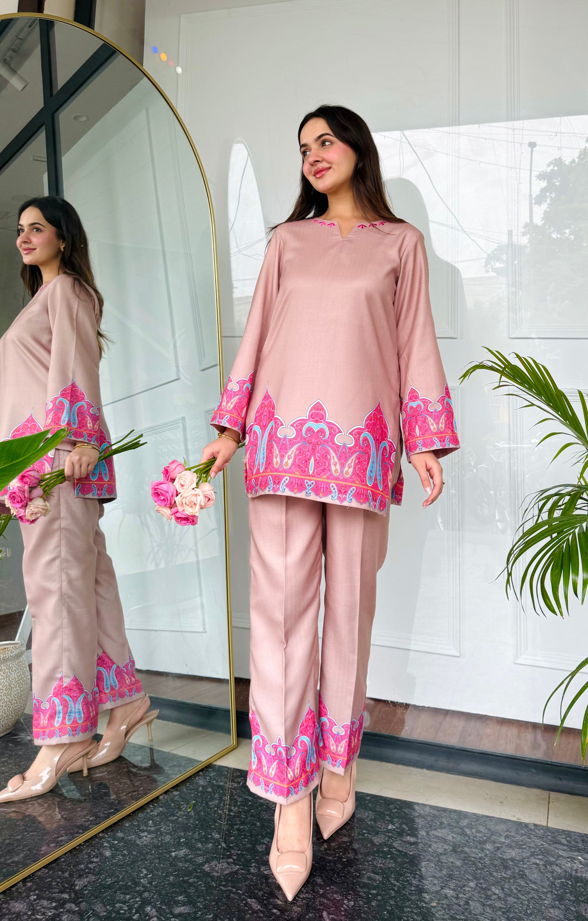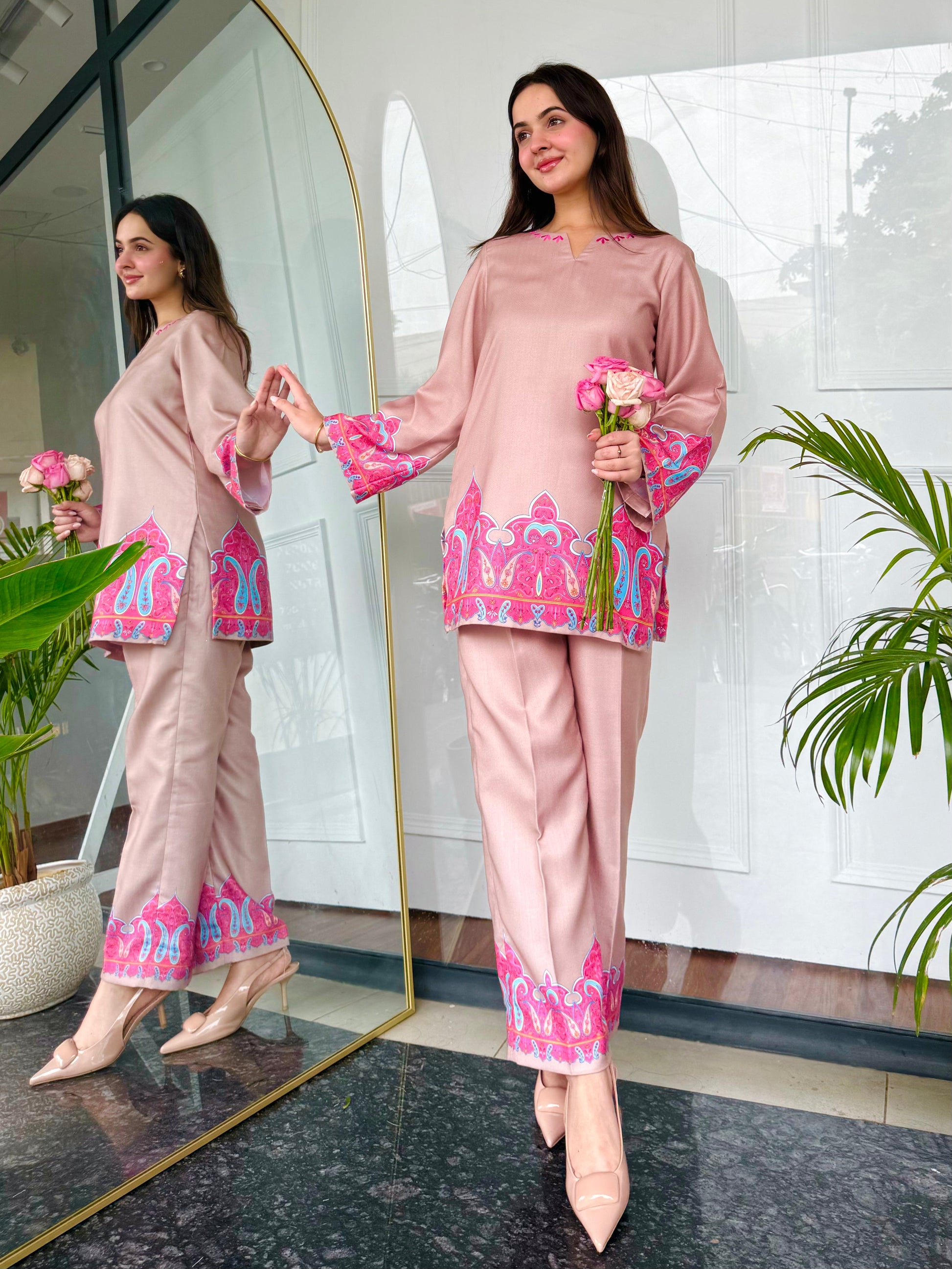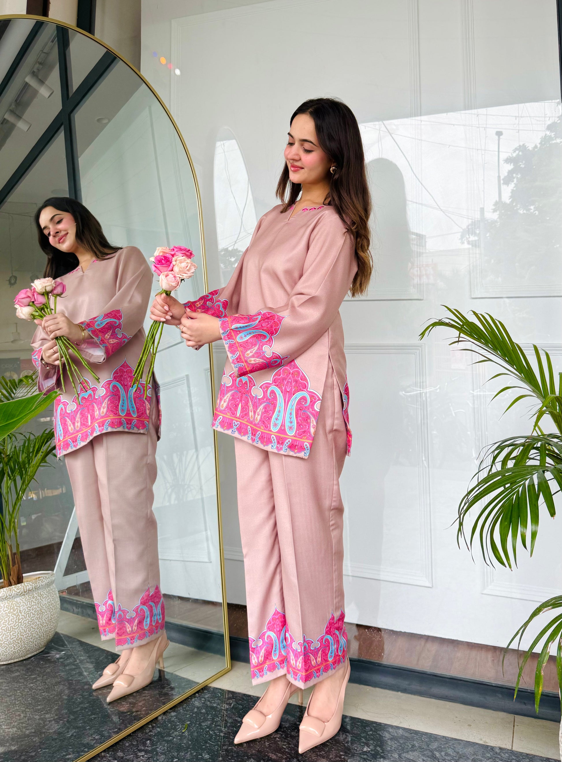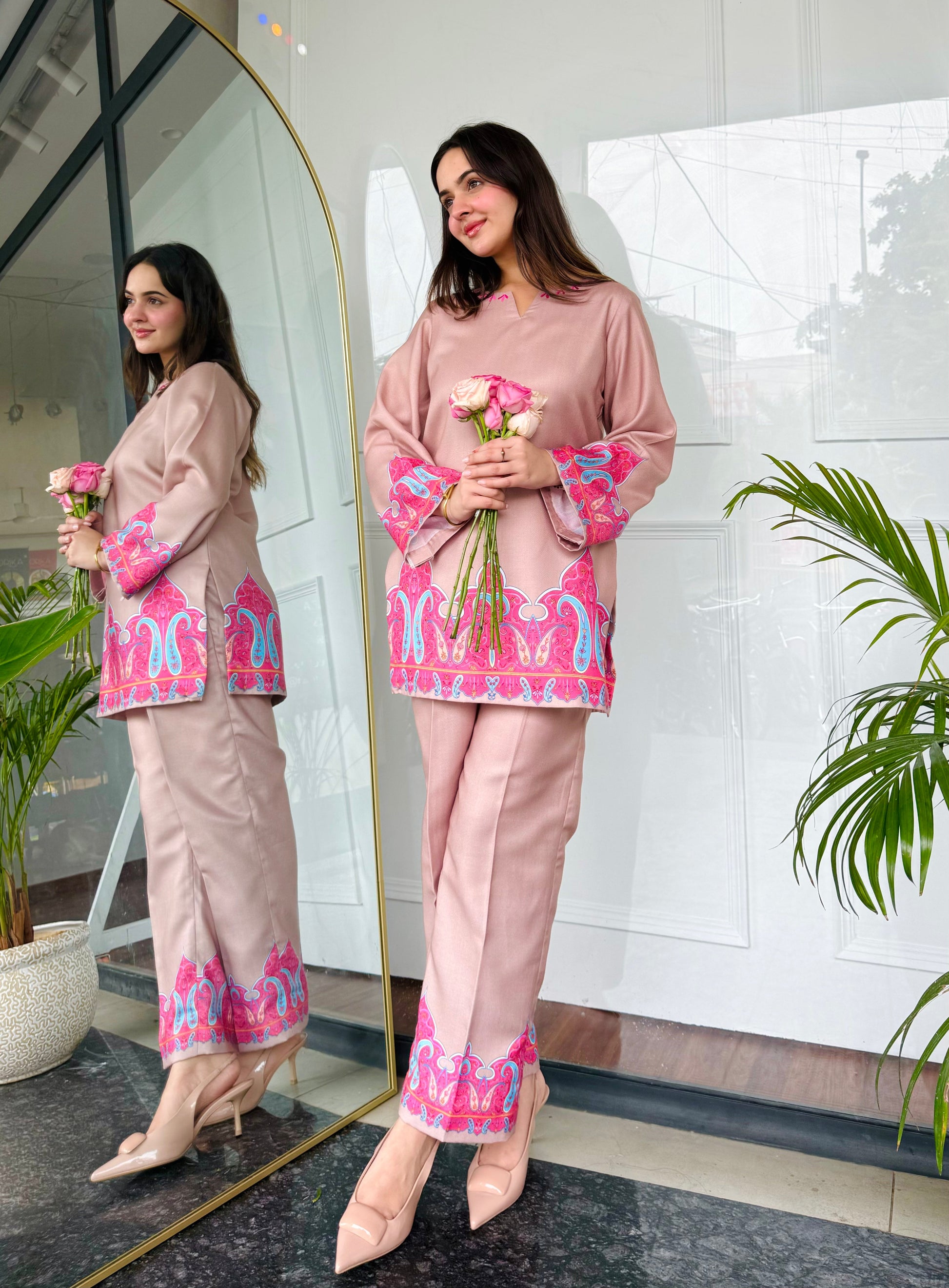 Elegant pastel pink co-ord set adorned with vibrant architectural digital prints, offering a perfect blend of tradition and modern charm.