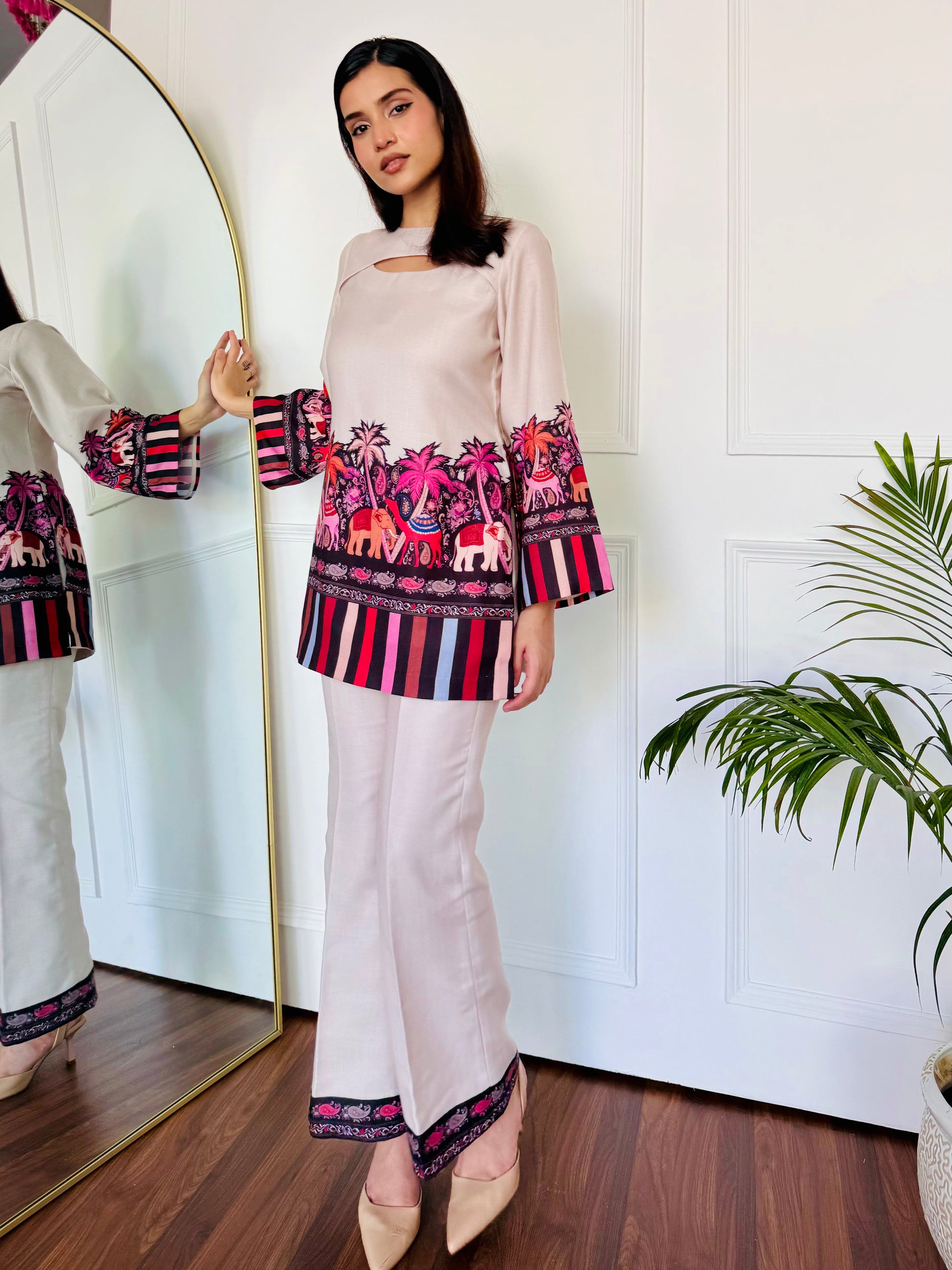 Fashionable animal printed co-ord set featuring an elegant elephant motif kurta with striped detailing. Soft rayon fabric makes it perfect for stylish daily wear,