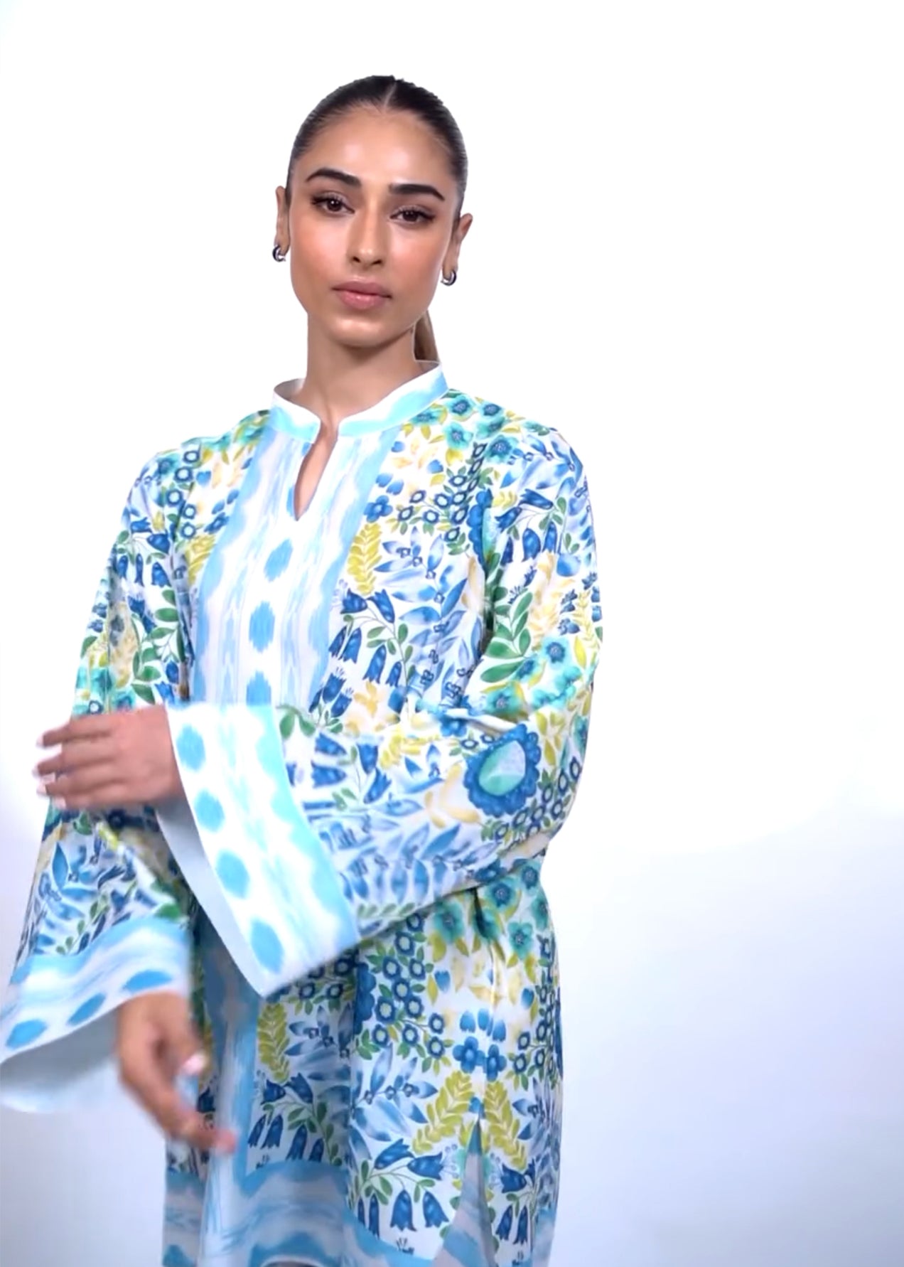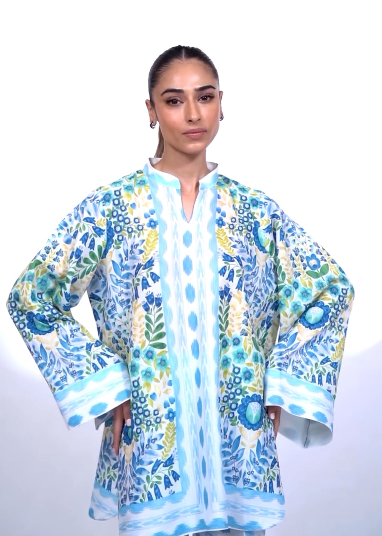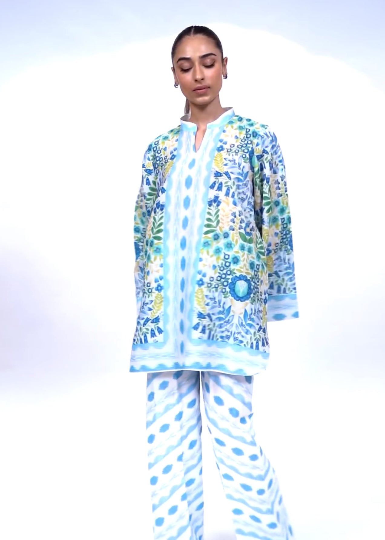 A breezy co-ord set with vibrant floral digital prints and abstract ikat trousers in soothing blue tones. Stylish, airy, and perfect for summer chic,