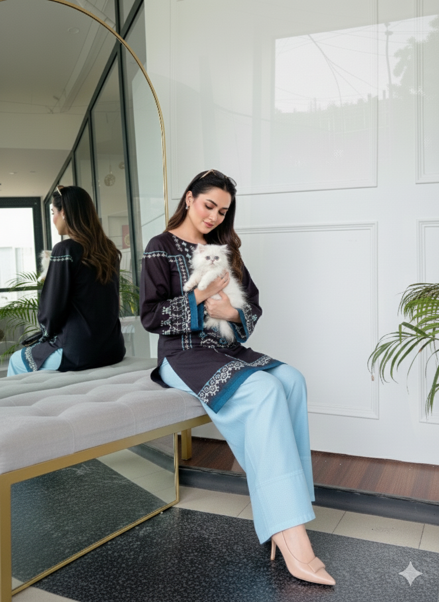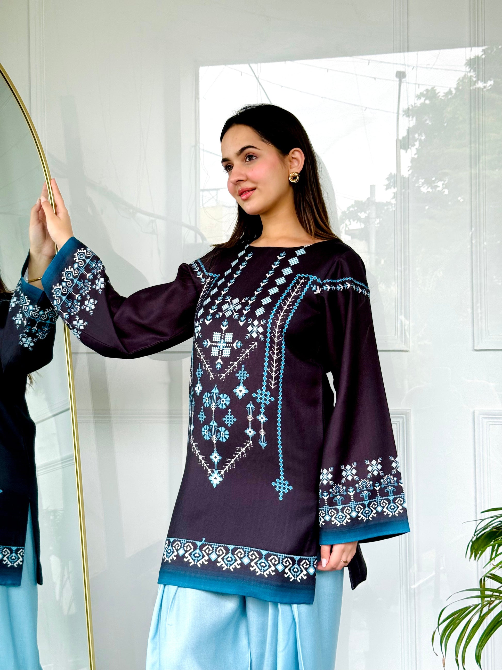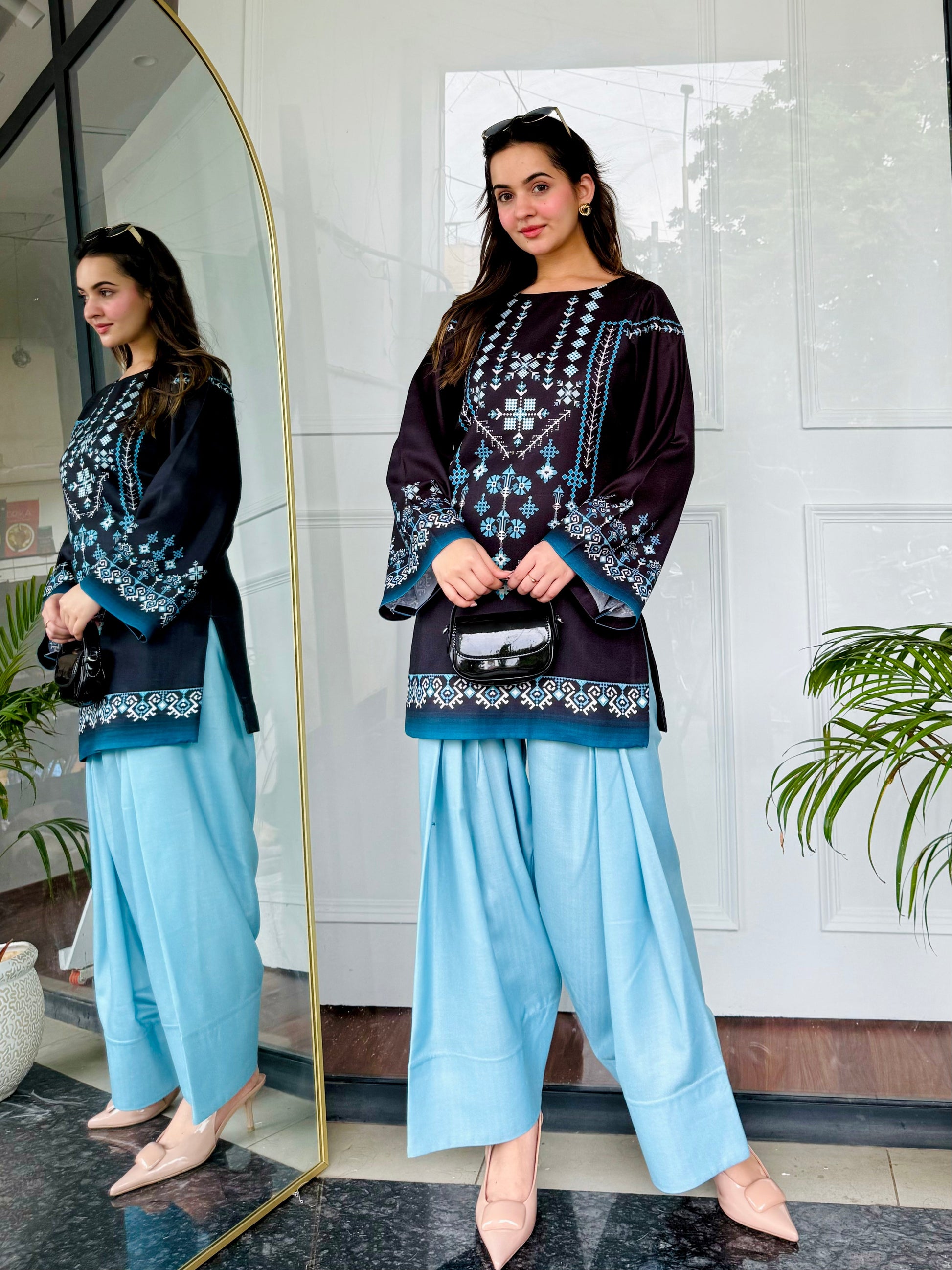 Elegant black and blue embroidered co-ord set crafted from soft cotton, featuring geometric threadwork and flared sleeves for a chic ethnic look.