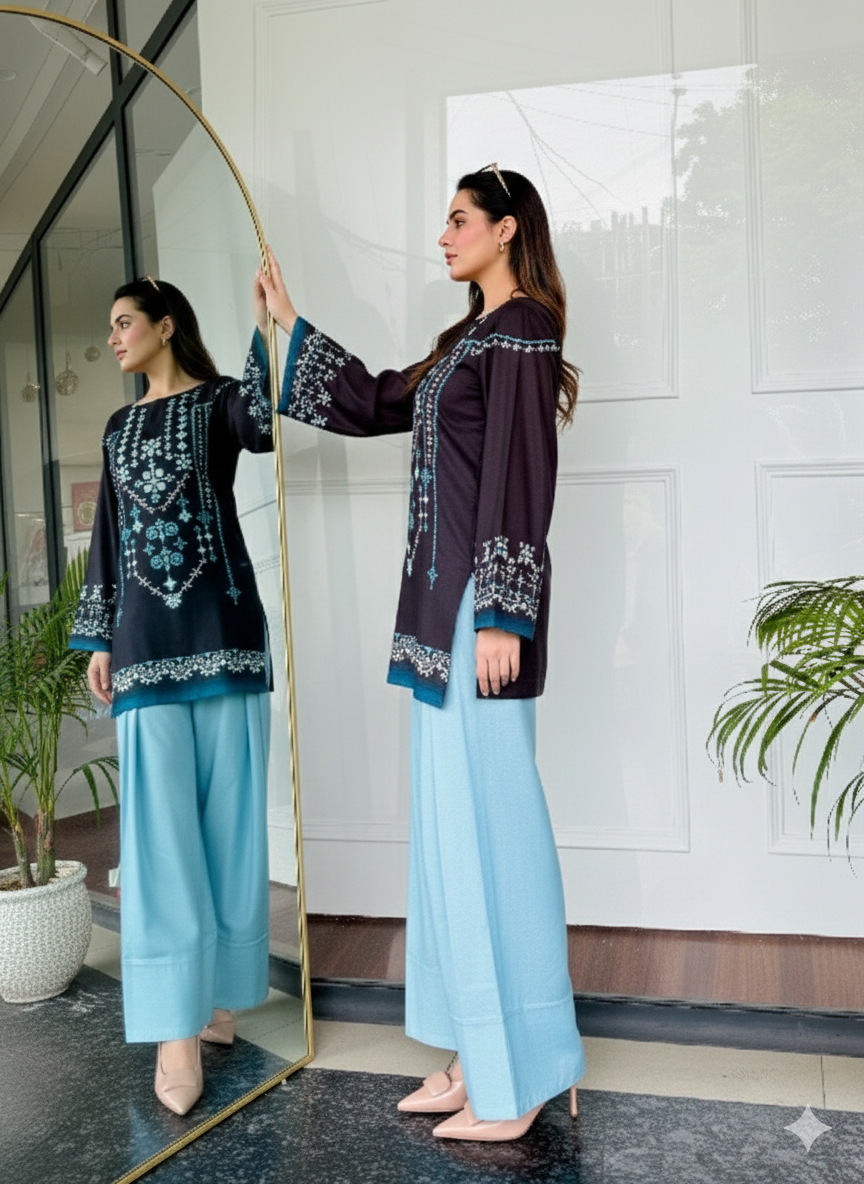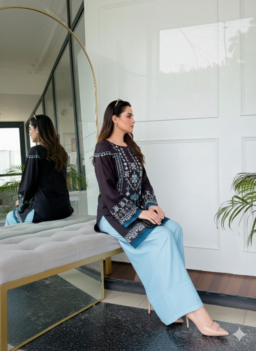 Elegant black and blue embroidered co-ord set crafted from soft cotton, featuring geometric threadwork and flared sleeves for a chic ethnic look.