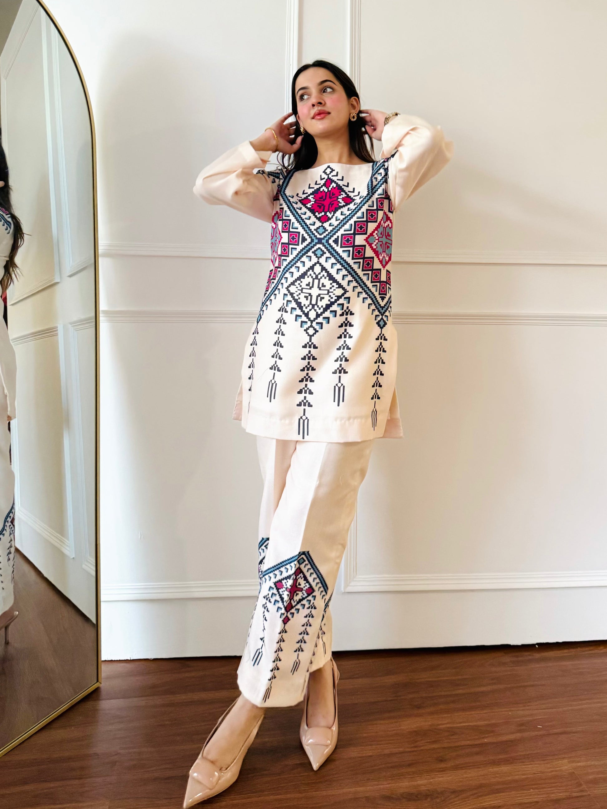 Stylish rayon co-ord set with geometric tribal print, offering a soft, breathable, and trendy look for everyday wear.