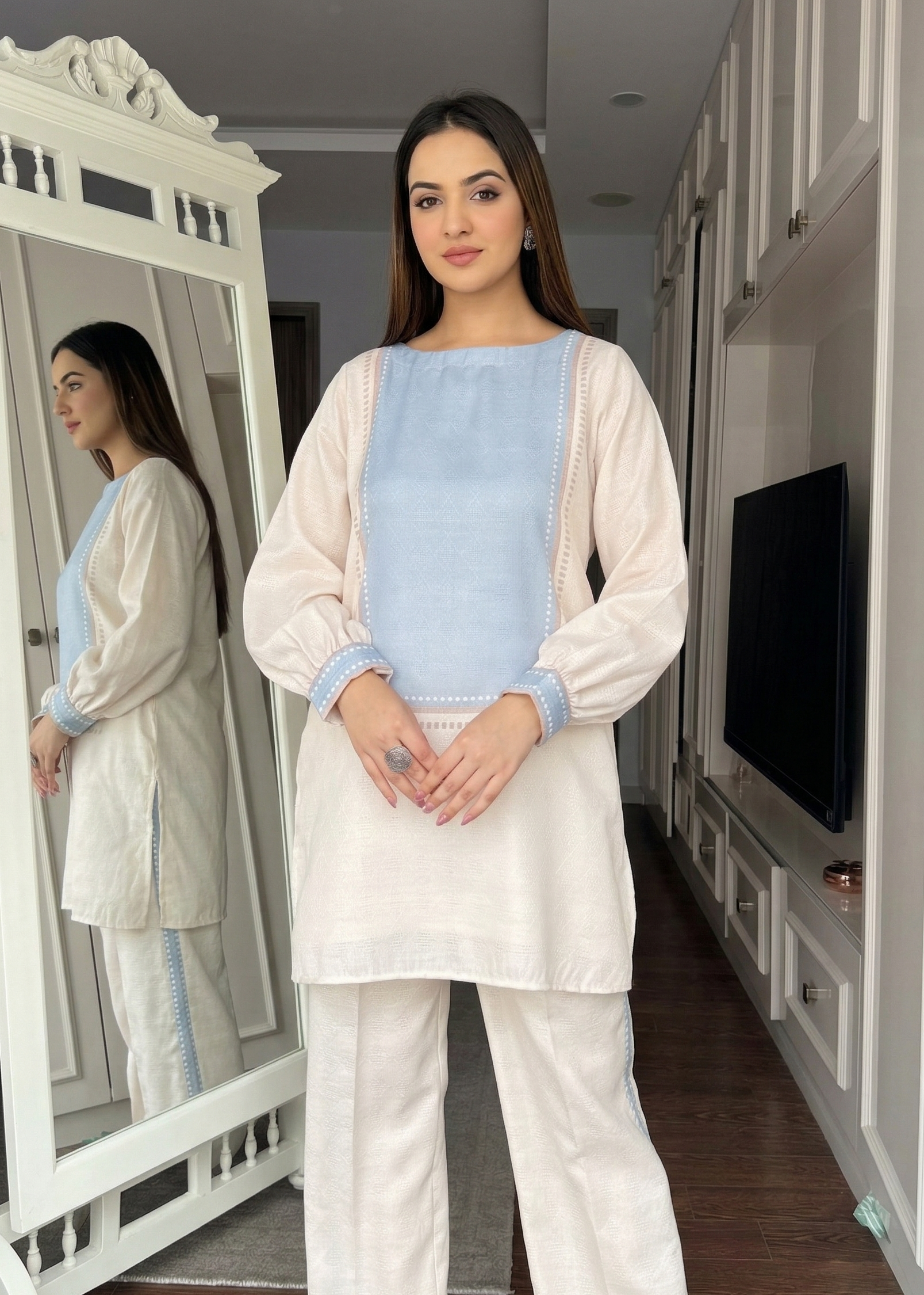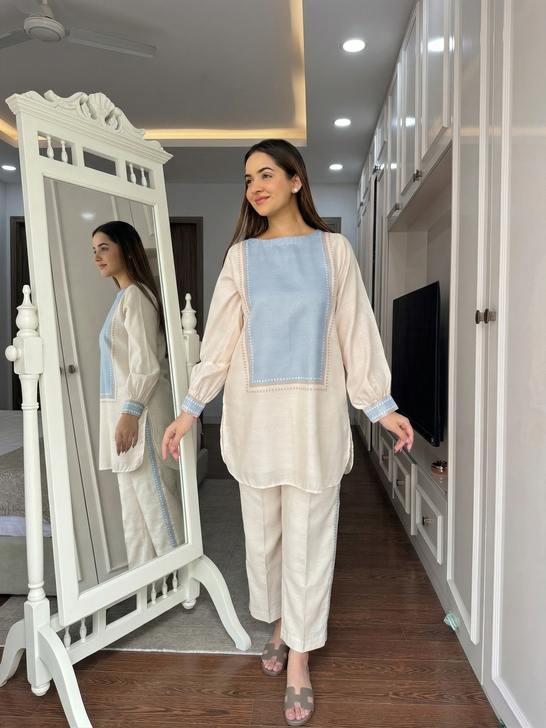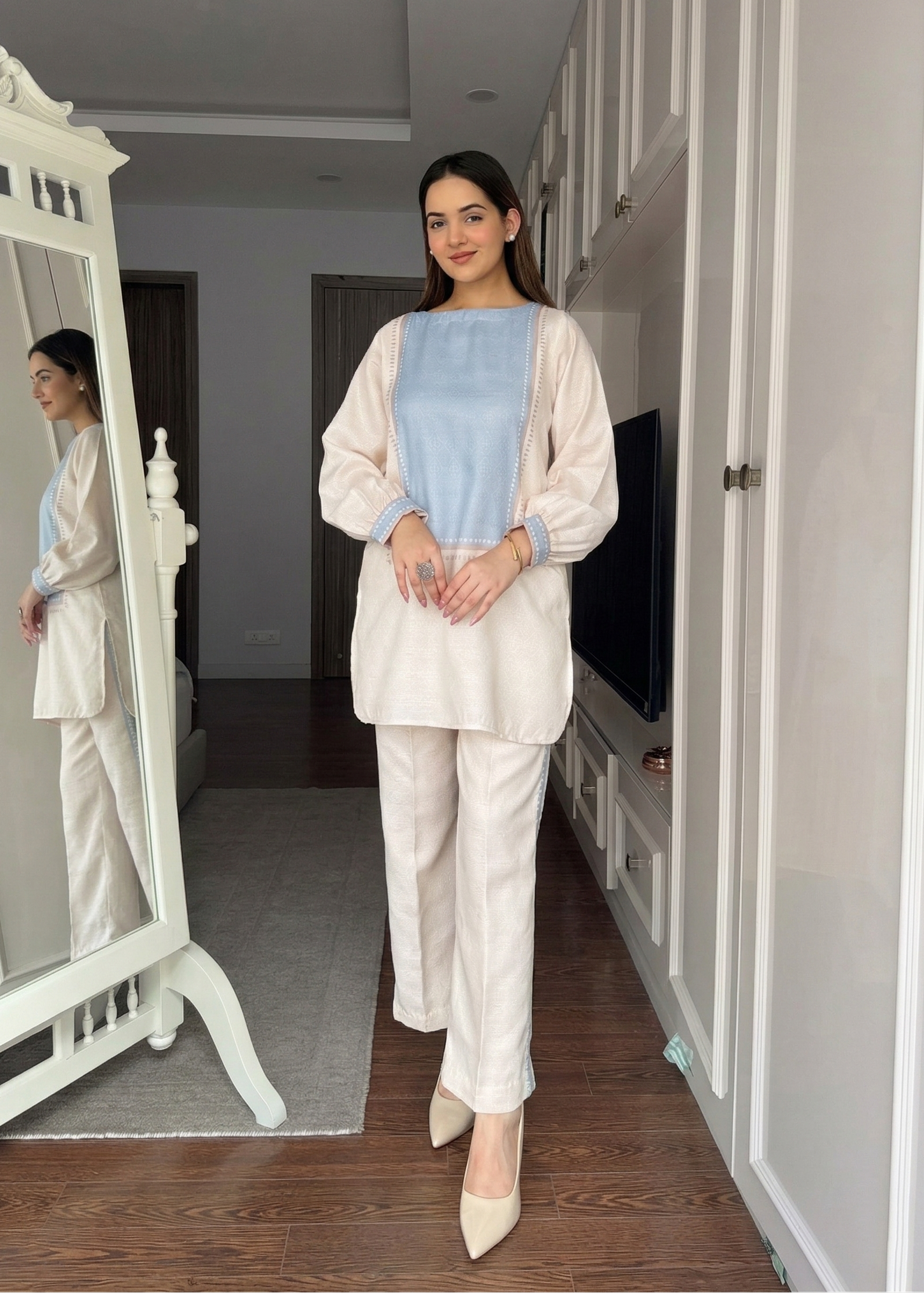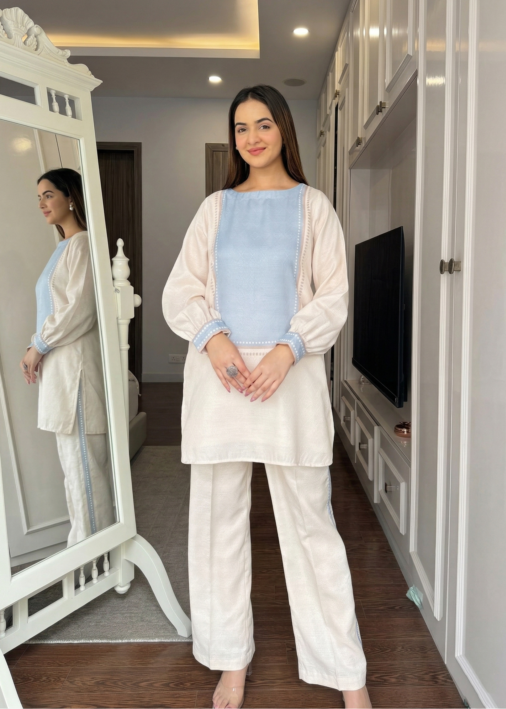 Made from breathable linen, this set is super comfortable for everyday wear. The soft pastel shade with subtle prints gives it a clean, minimal look without trying too hard. The kurta has a relaxed fit, and the straight pants fall nicely, making it easy to wear all day.