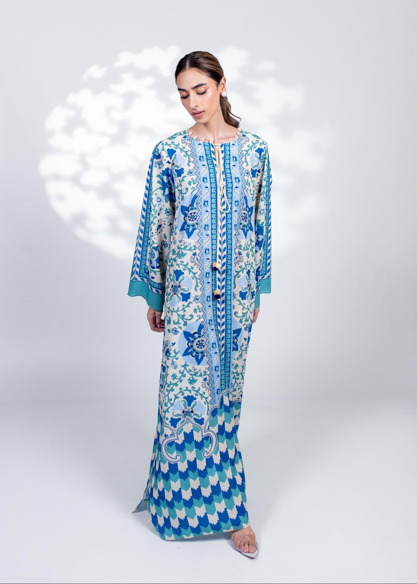 This blue and white printed kaftan is designed for effortless comfort with a graceful look. Made in a soft, flowy fabric, it falls beautifully on the body and feels light all day long. The detailed print gives it a classy touch, while the relaxed silhouette makes it easy to wear for long hours.
