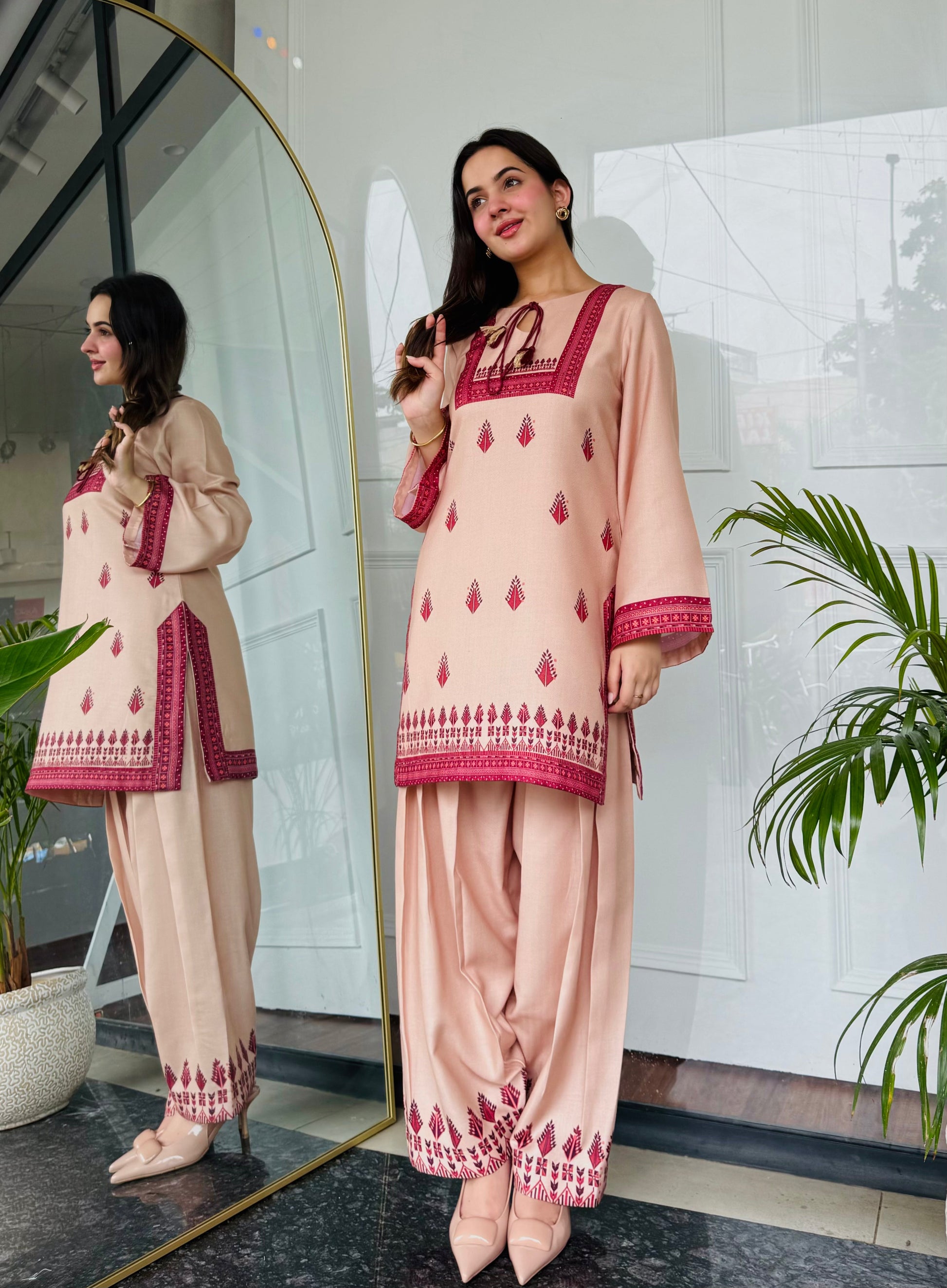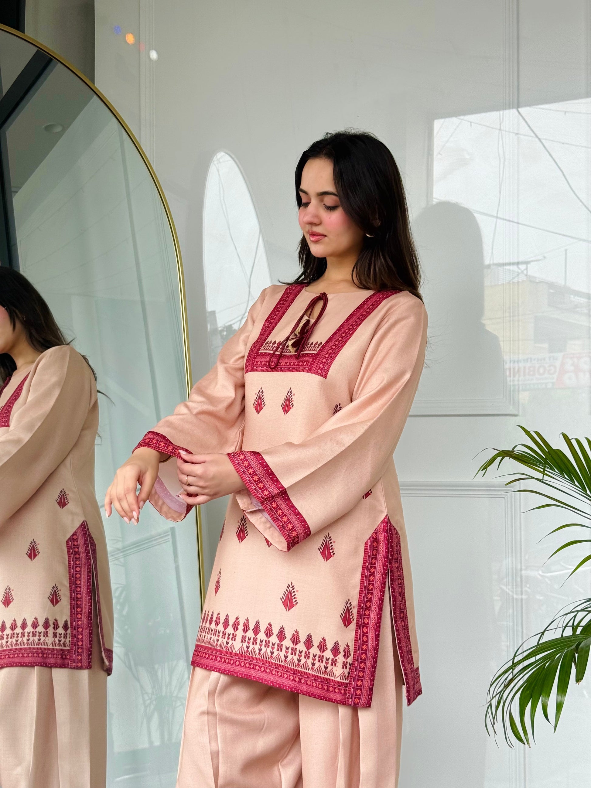 Elevate your everyday look with this peach co-ord set featuring geometric block prints and contrast borders. Crafted in soft, breathable fabric, it blends traditional charm with modern comfort for effortless style.