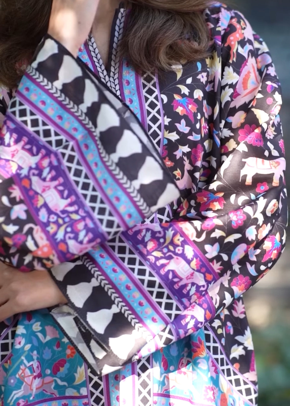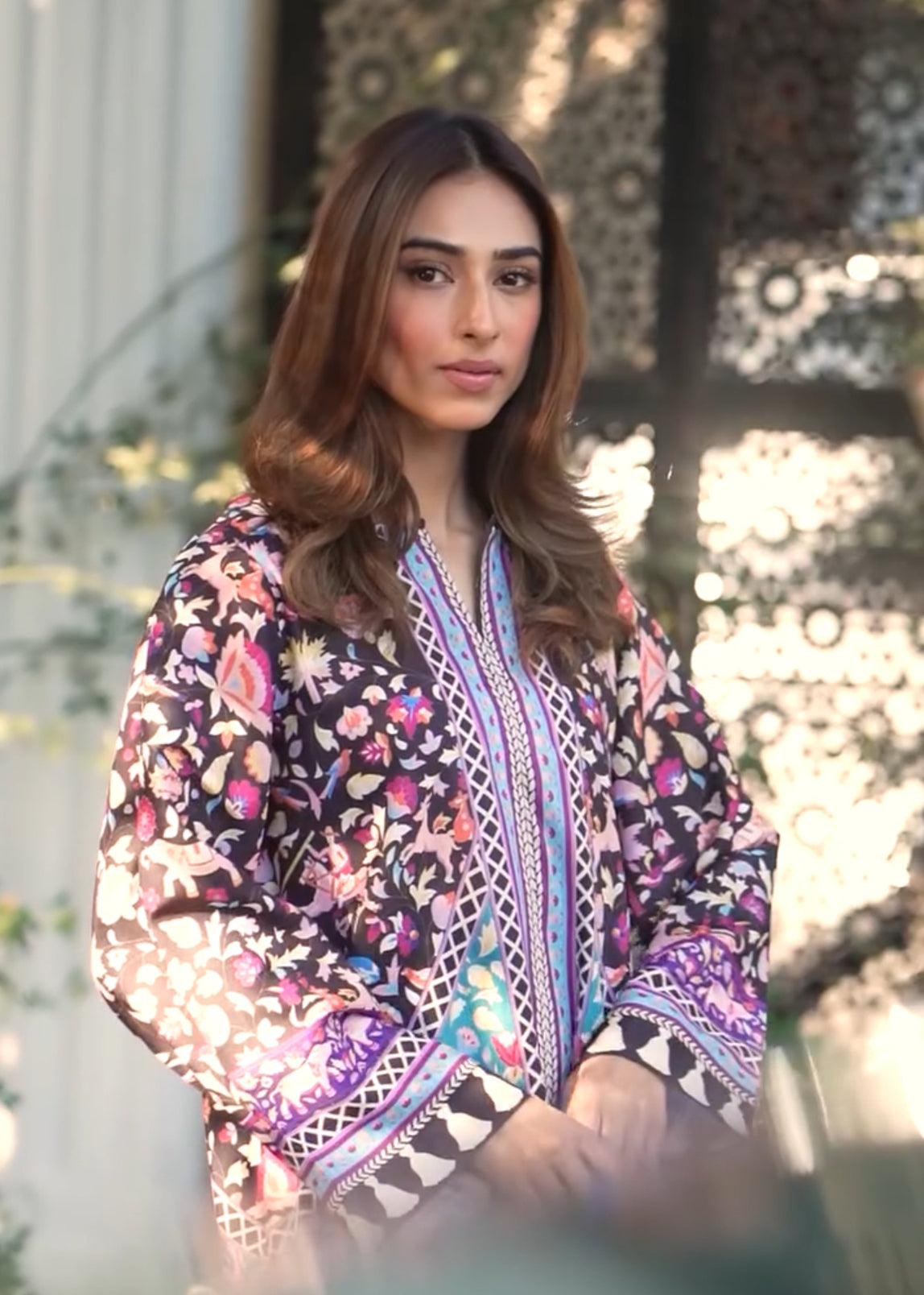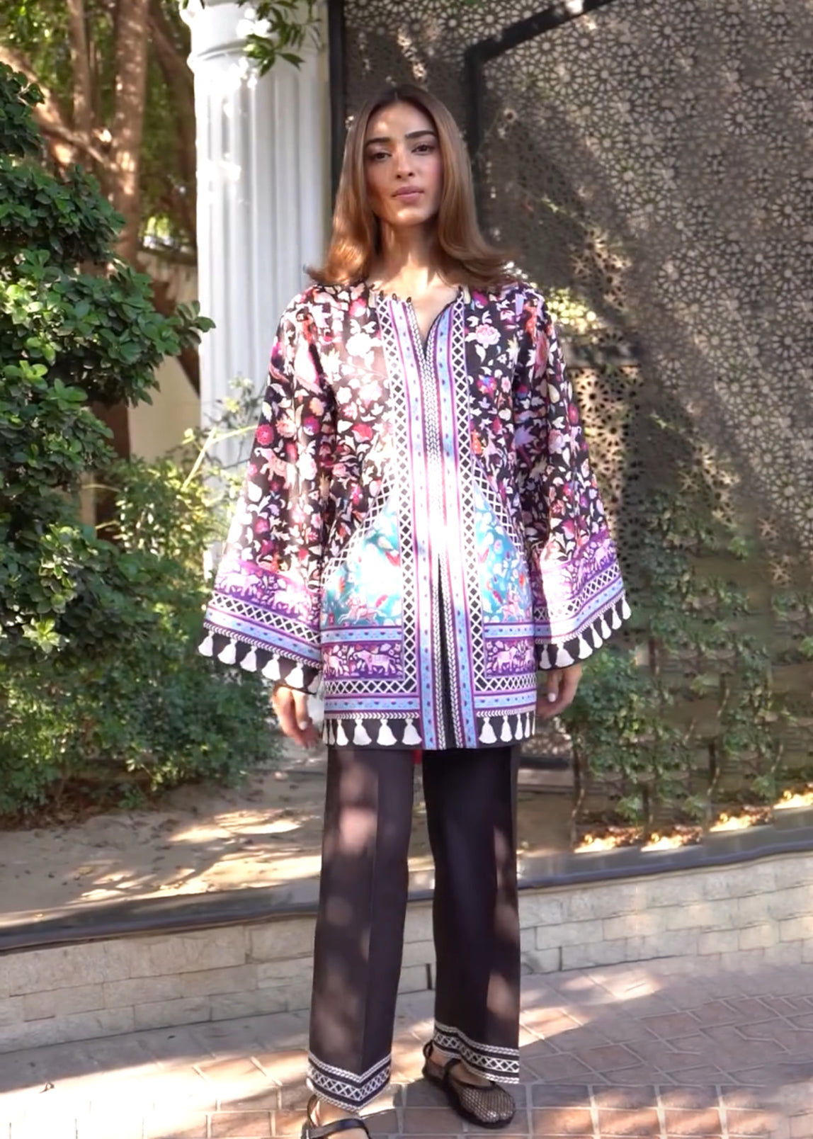 A chic co-ord set with floral and geometric digital prints, detailed borders, and plain trousers. Perfect blend of comfort and contemporary elegance.