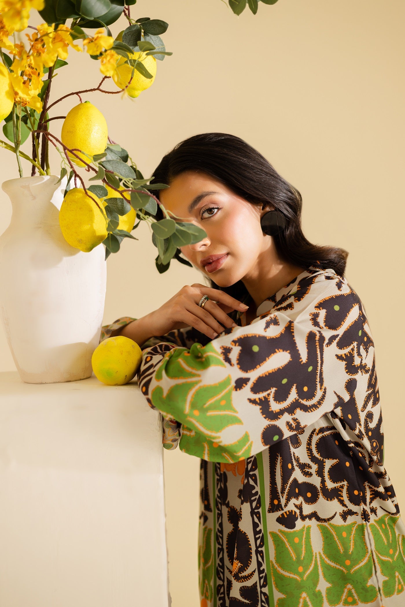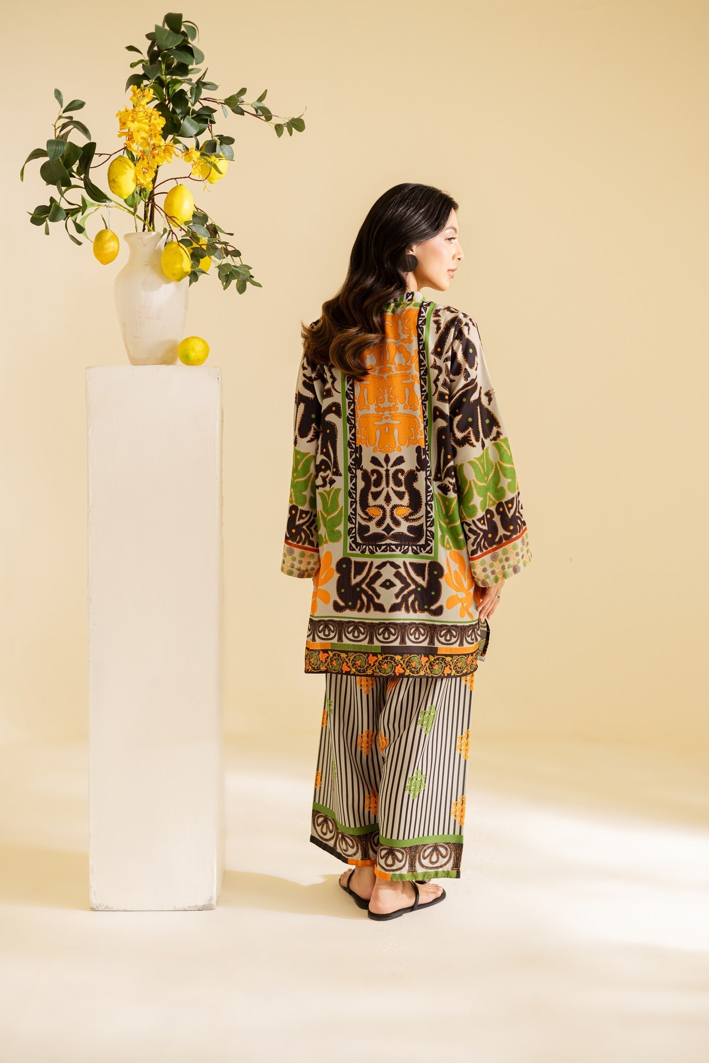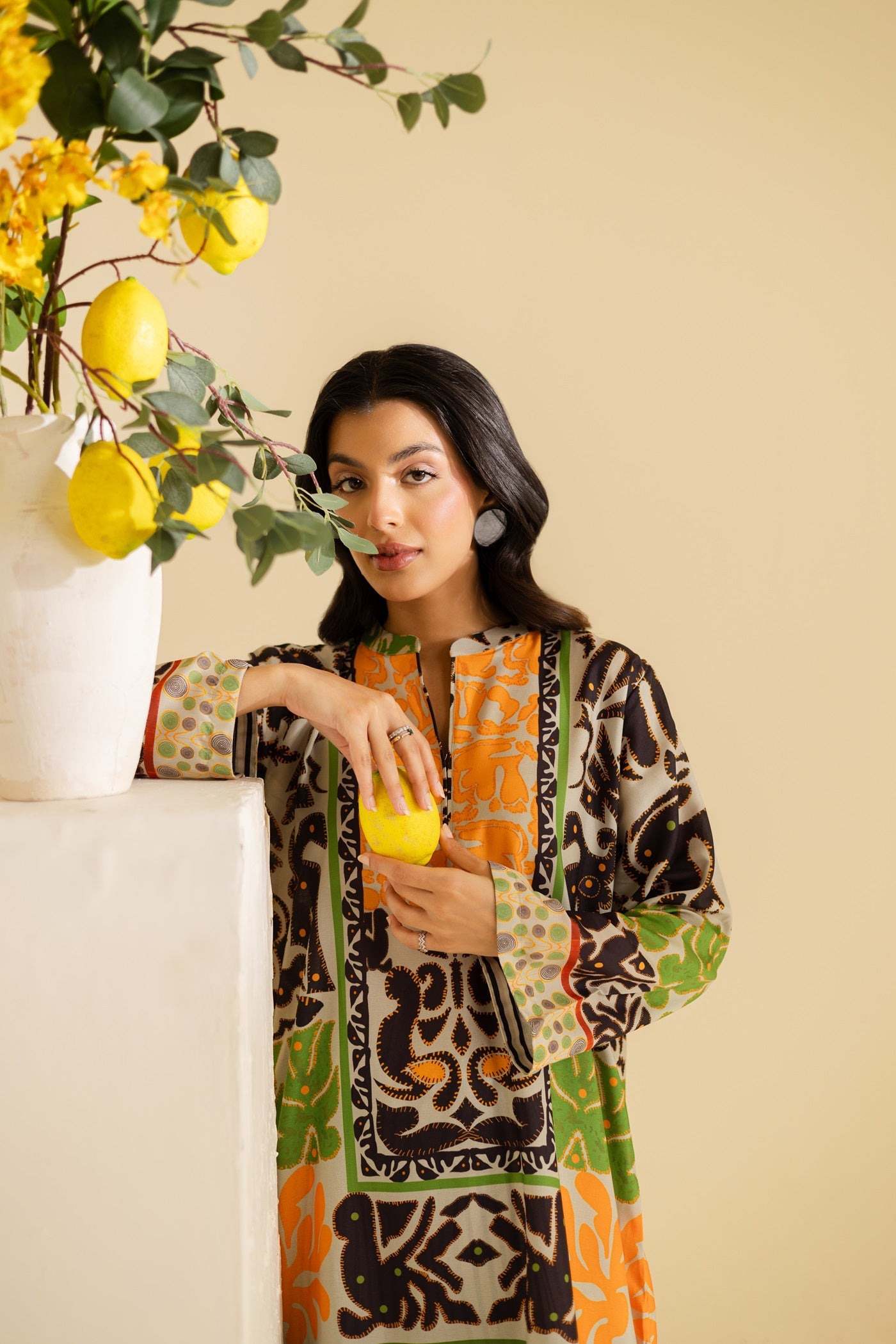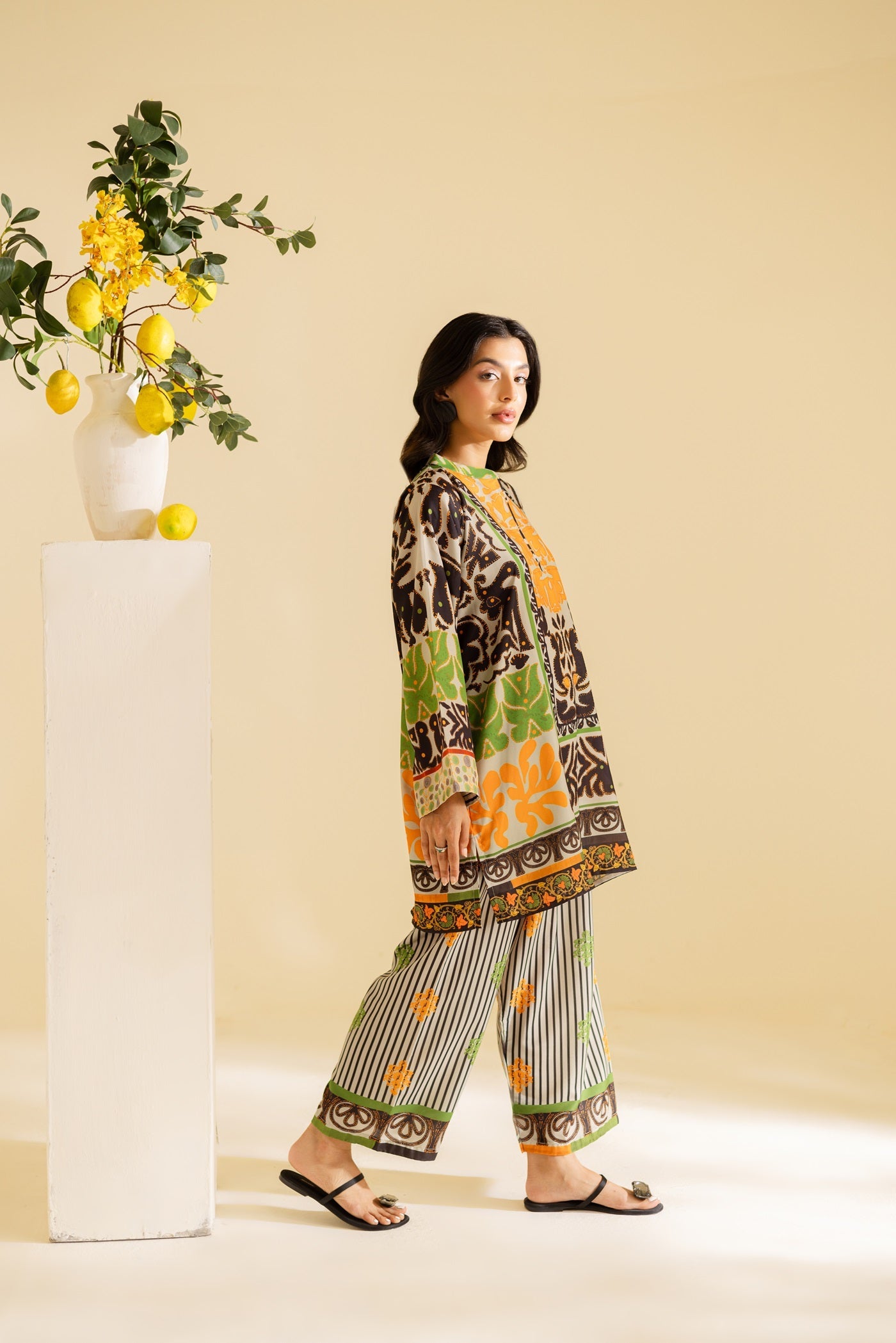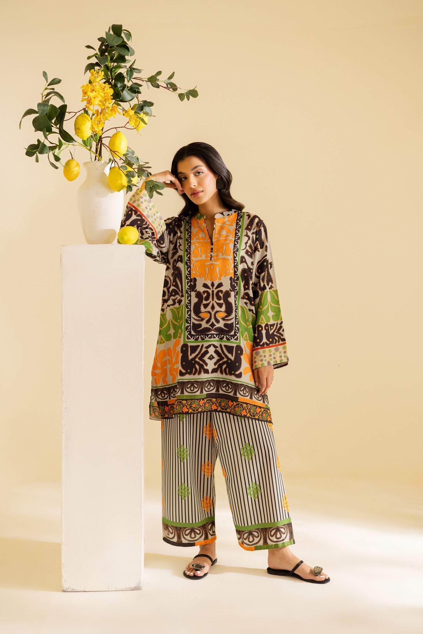 A bold abstract co-ord set in orange, green, and black, designed on a cream base for a striking yet elegant look.